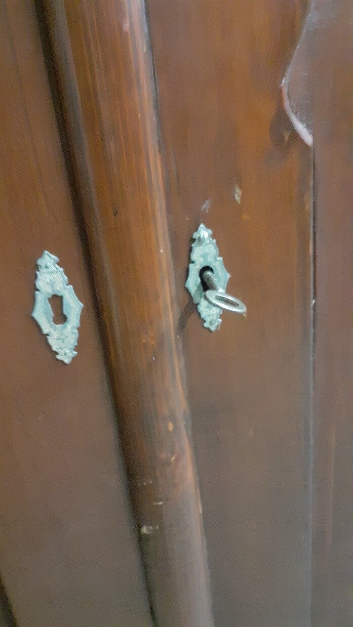 De rechterdeur is aan de bovenkant iets wat krom maar het heeft geen invloed op het sluiten van de deuren. De deuren sluiten netjes, het slot werkt naar behoren en de sleutel is aanwezig. De linkerdeur sluit met een haakje.
