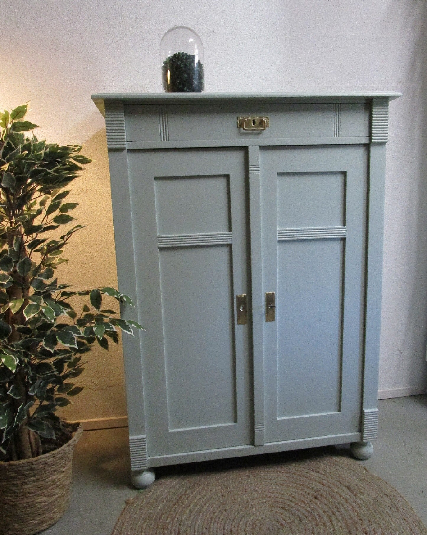 Het kastje is gereinigd, preventief tegen houtworm behandeld en nagelopen.