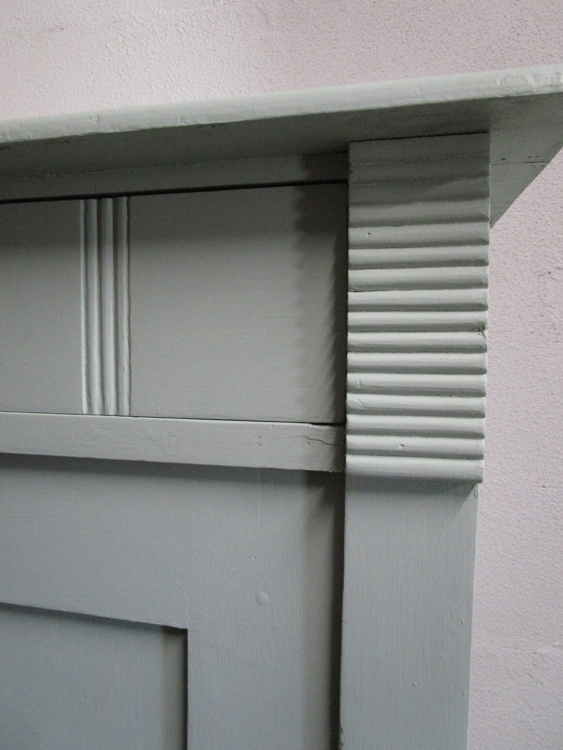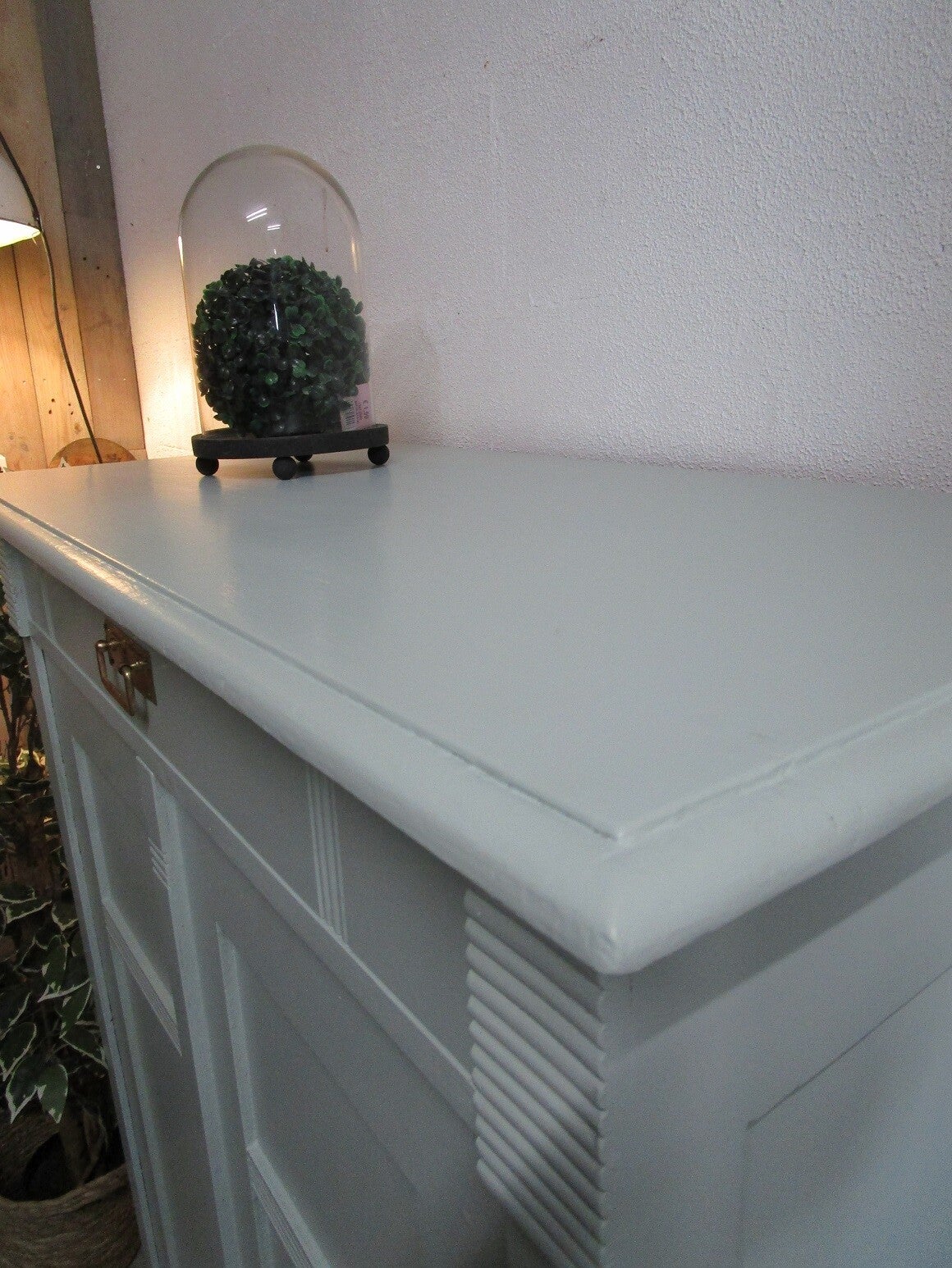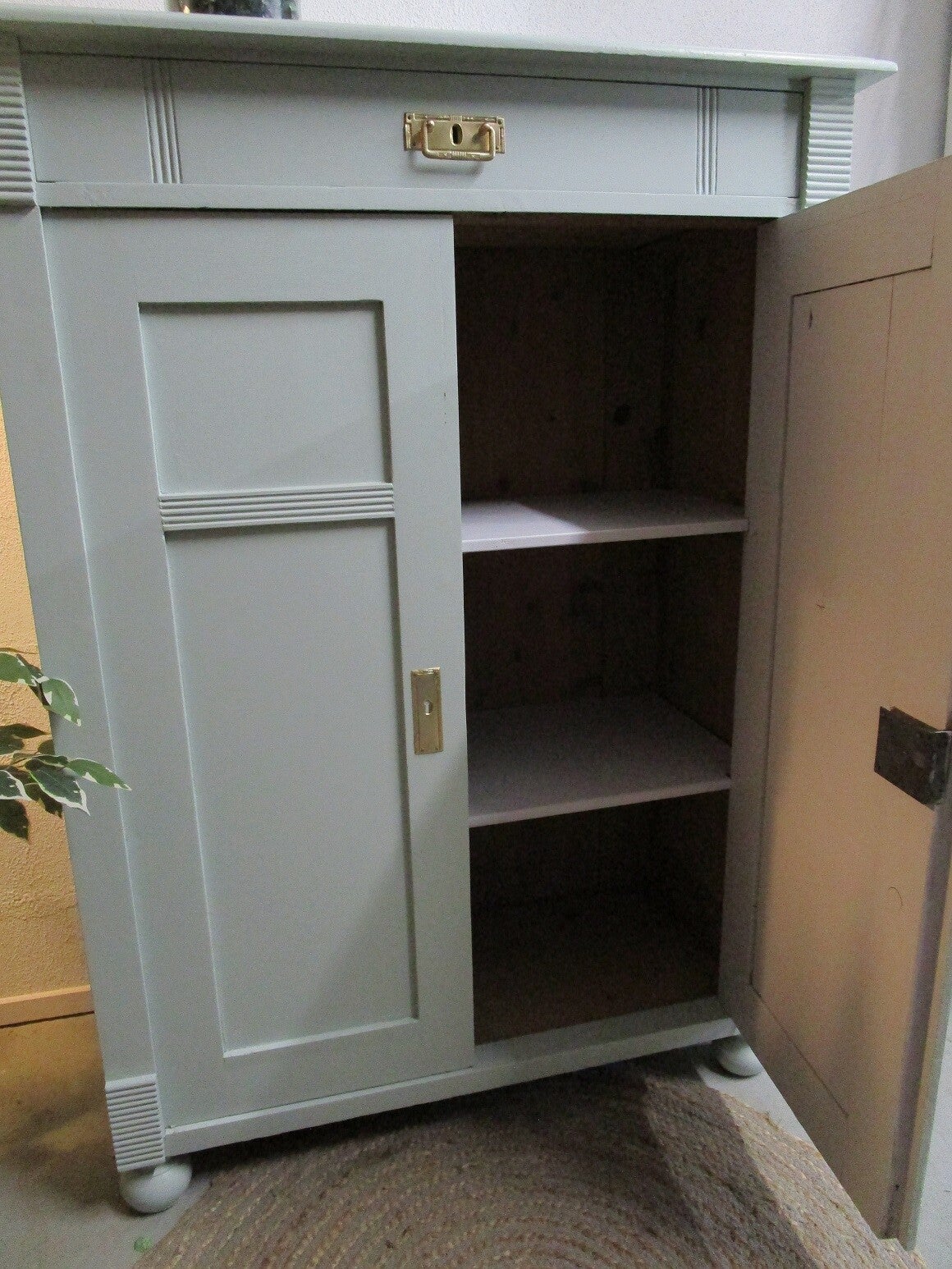 De buitenzijde van de kast is in een mintgroene kleur geschilderd. De planken hebben we een licht grijze kleur gegeven.