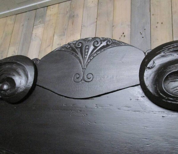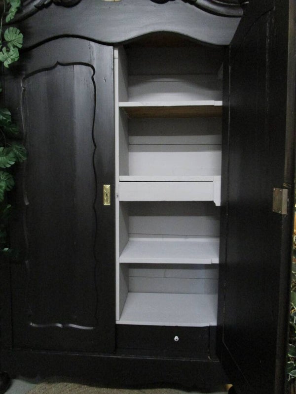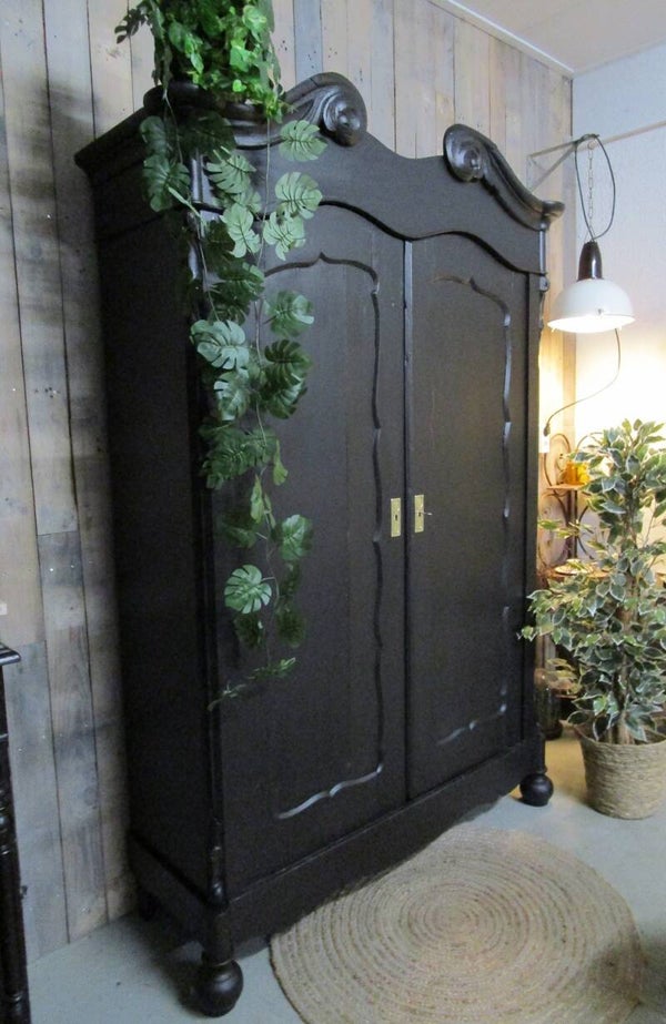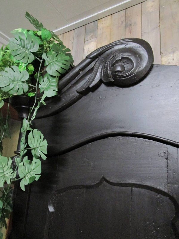 De kast is aan de buitenzijde geschilderd in een mat zwarte kleur. De binnenzijde hebben we een zacht grijze kleur gegeven, wat een prachtig contrast geeft.