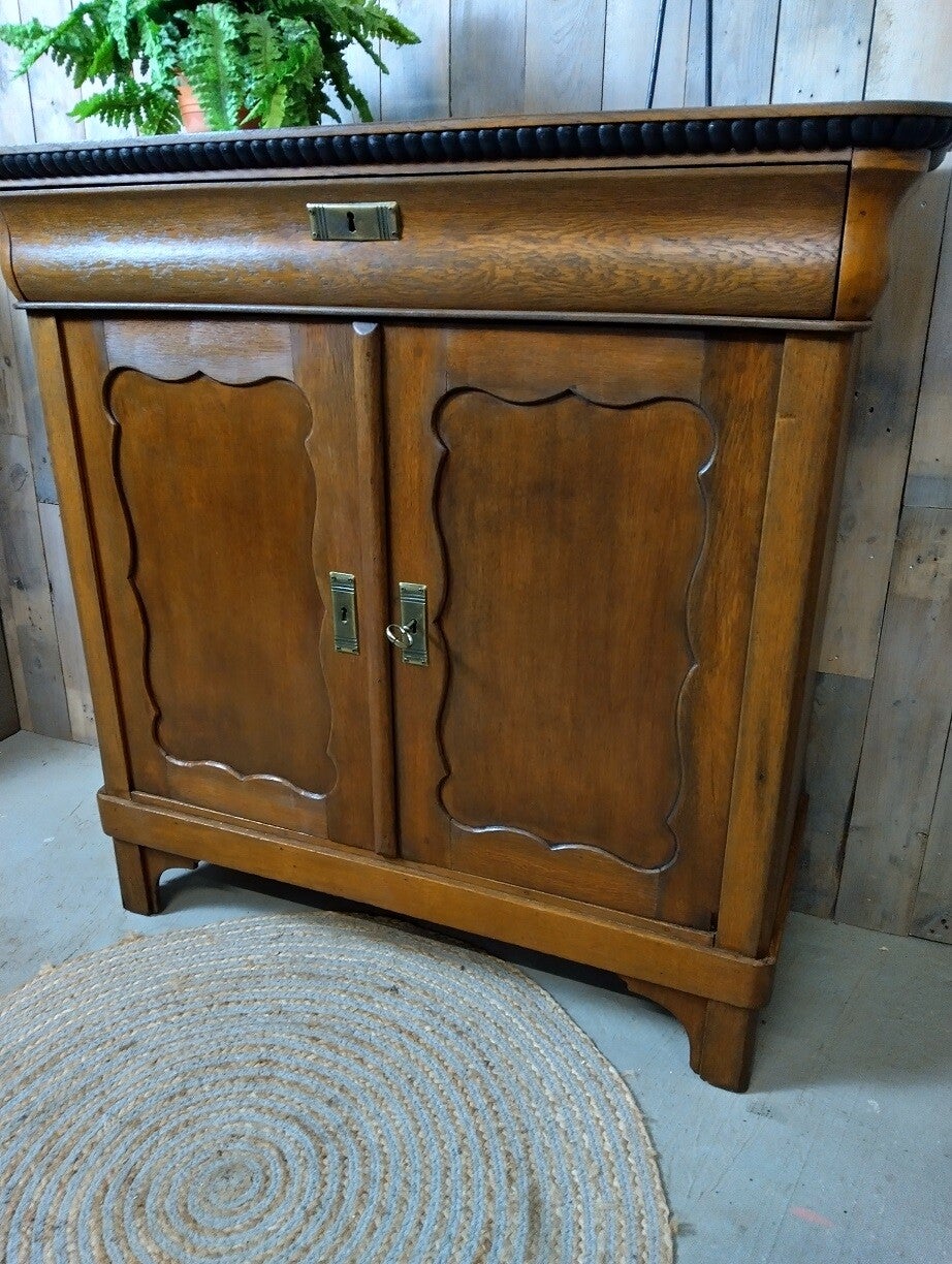 De kast heeft een ruime lade, daaronder 2 openslaande deurtjes. Achter de deurtjes bevindt zich een legplank.