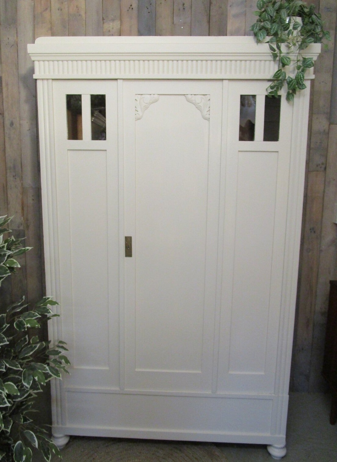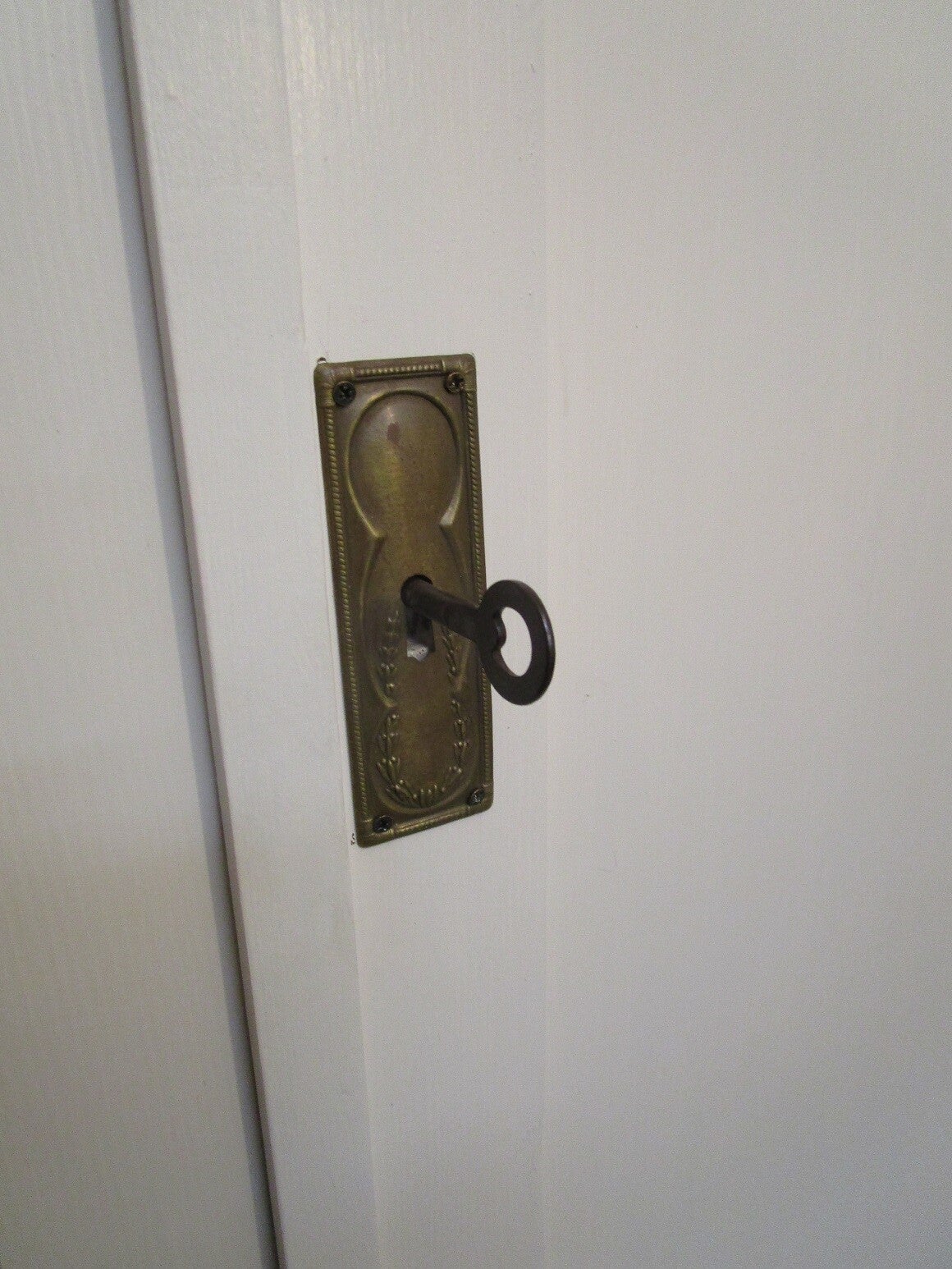 Links heeft de kast een smalle deur die middels twee schuifjes sluit. De rechter, grote deur, sluit met een sleutel.