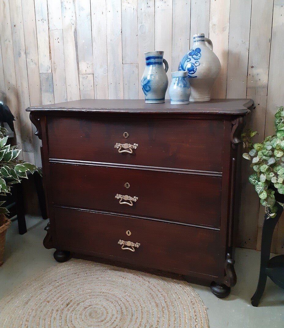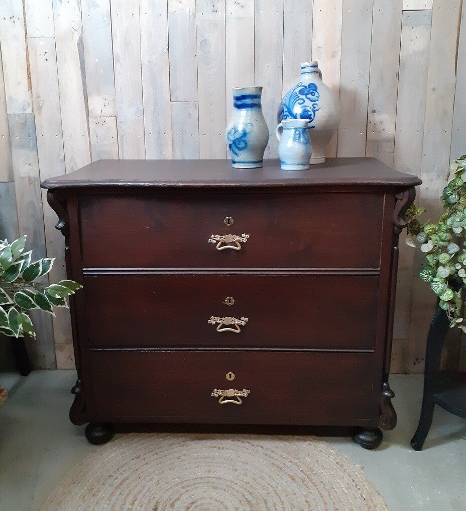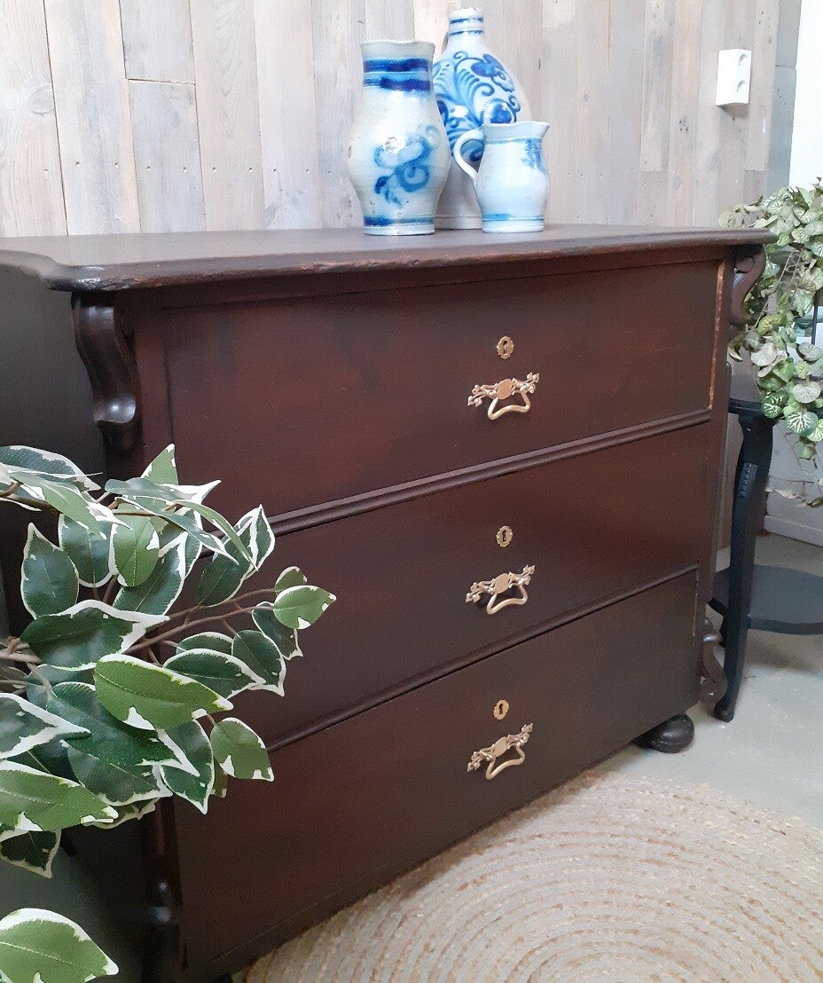 Hij is eenvoudig, maar juist daardoor is deze geleefde landelijke grenen ladekast en plaatje. Het kastje is zeer oud en zijn oneffenheden geven hem net dat stoere. De kleur is origineel en komt het dichts bij de kleur wengé, een warme bruine kleur.