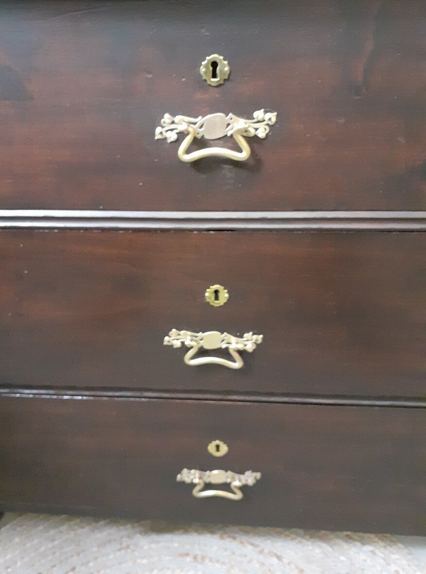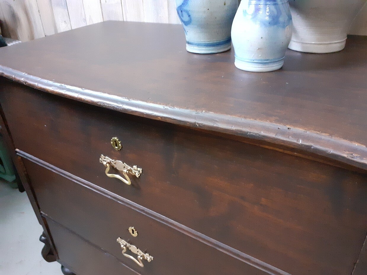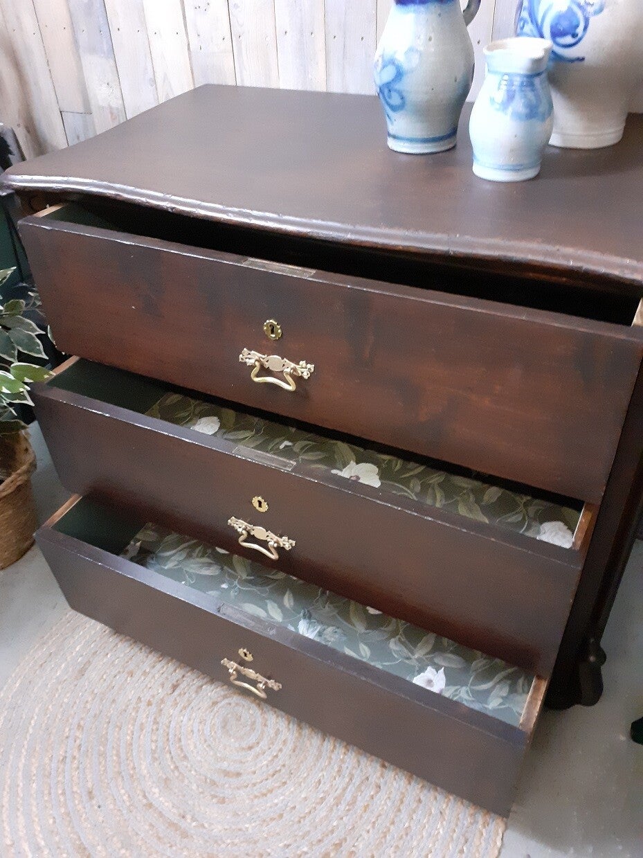 Hij is eenvoudig, maar juist daardoor is deze geleefde landelijke grenen ladekast en plaatje. Het kastje is zeer oud en zijn oneffenheden geven hem net dat stoere. De kleur is origineel en komt het dichts bij de kleur wengé, een warme bruine kleur.
