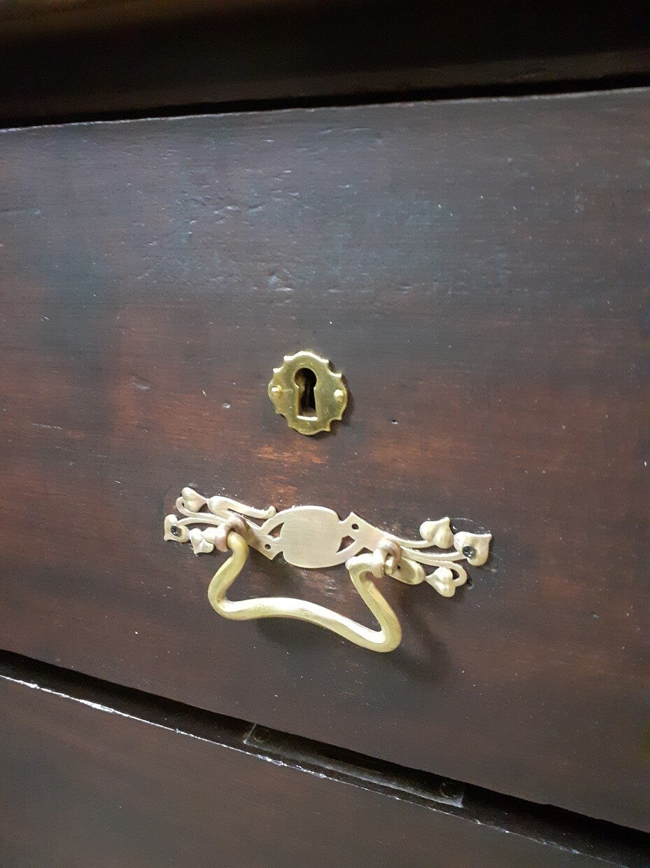 Het originele meubelbeslag is gereinigd en teruggeplaatst.