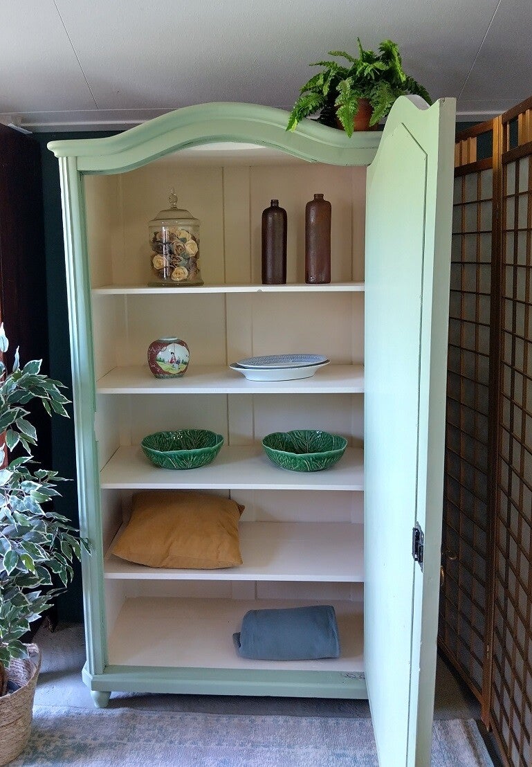 We hebben de kast aan de buitenzijde een oudgroene kleur gegeven, de binnenkant is katoen, een roomwitte kleur.