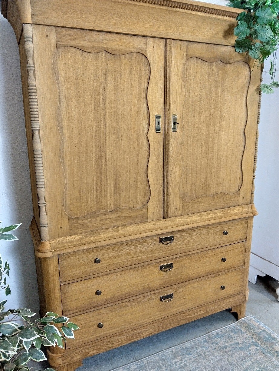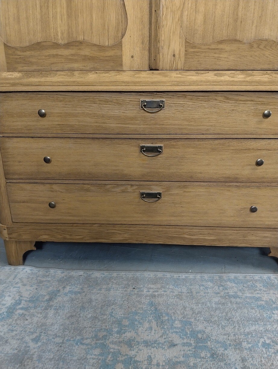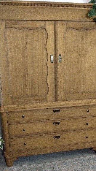 We hebben de kast gestraald, hiermee is de oude waslaag verwijderd en is het originele hout weer tevoorschijn gekomen. Een warme eiken kleur.