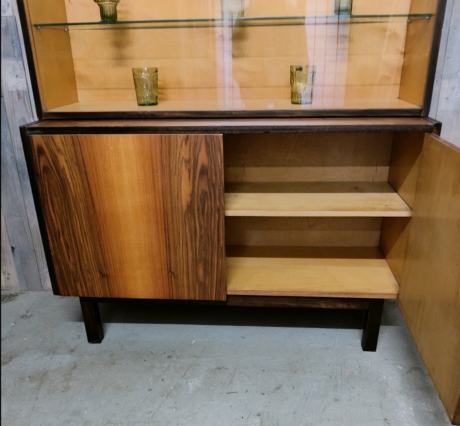 Mooie vintage vitrinekast uit Polen. De kast dateert begin 1970 en is voor haar leeftijd in een nette vintage staat. Kleine oneffenheden sieren de kast.