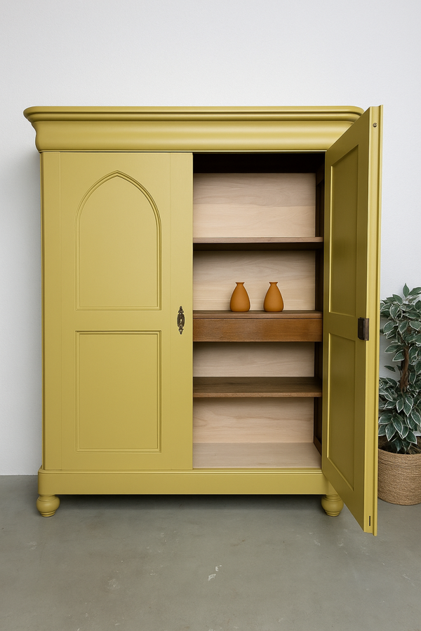We hebben de kast de kleur okergeel (RAL1024) gegeven een vrolijke warme kleur die de kast prima staat.