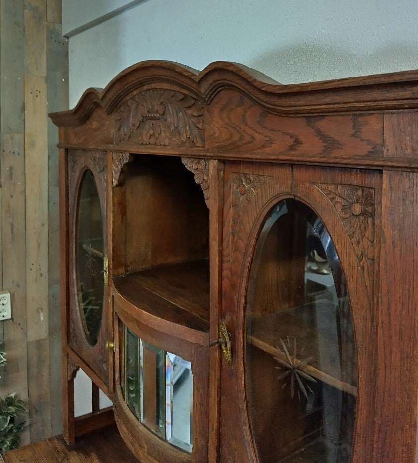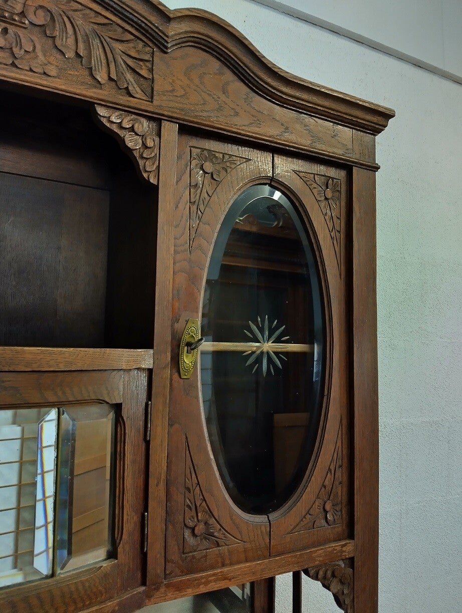 Het bovenste deel van de kast heeft drie deurtjes, twee deurtjes zijn voorzien van ovaal facet geslepen glas,het middelste deurtje heeft spiegelglas,dit heeft wat weerplekjes. Boven de spiegeldeurtjes nog een vak. De deurtjes kunnen op slot, sluiten goed. Sleutel is aanwezig.