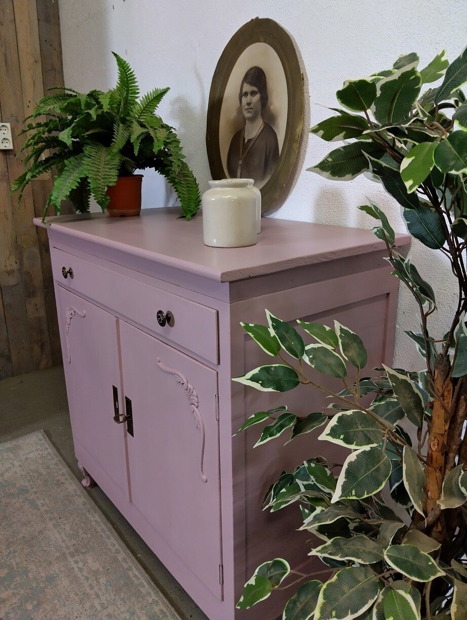 We hebben het kastje volledig nagelopen en gerepareerd waar dit nodig was. Het kastje heeft een warme oud roze kleur gekregen.