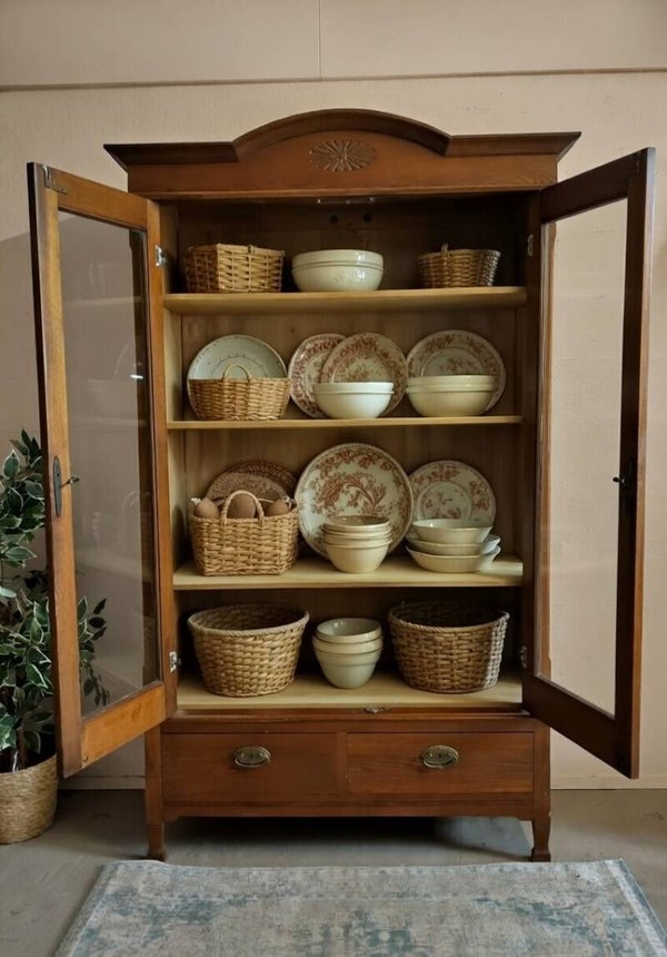 De kast is in nette vintage staat. Het facet geslepen glas in de deuren zijn netjes. De deuren sluiten goed.