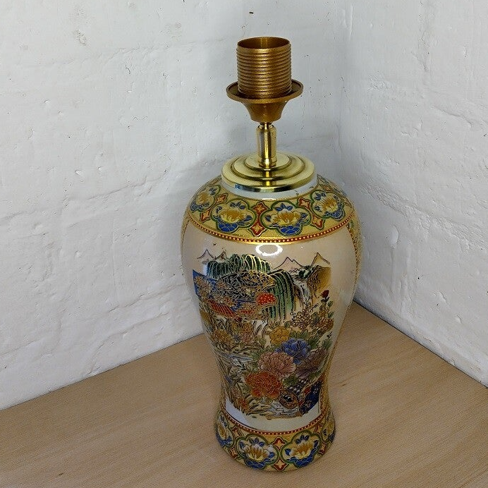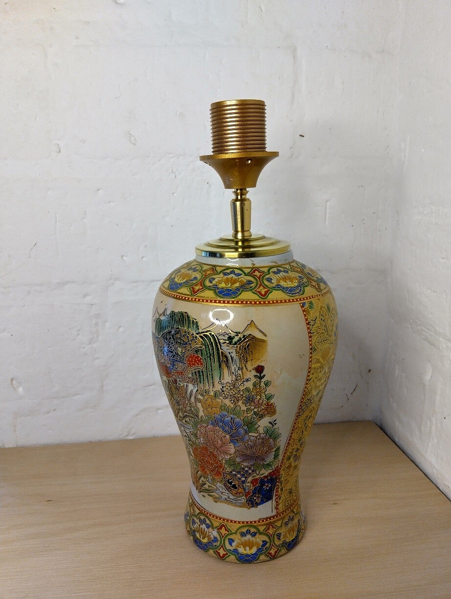 Lampenvoet gemaakt van een Chinese vaas. De vaas heeft een beige kleur. De opdrukken zijn goudkleurig aangevuld met rood, blauw, groen. De voorstelling op de vaas zijn een waterval, bergen en bloemen.