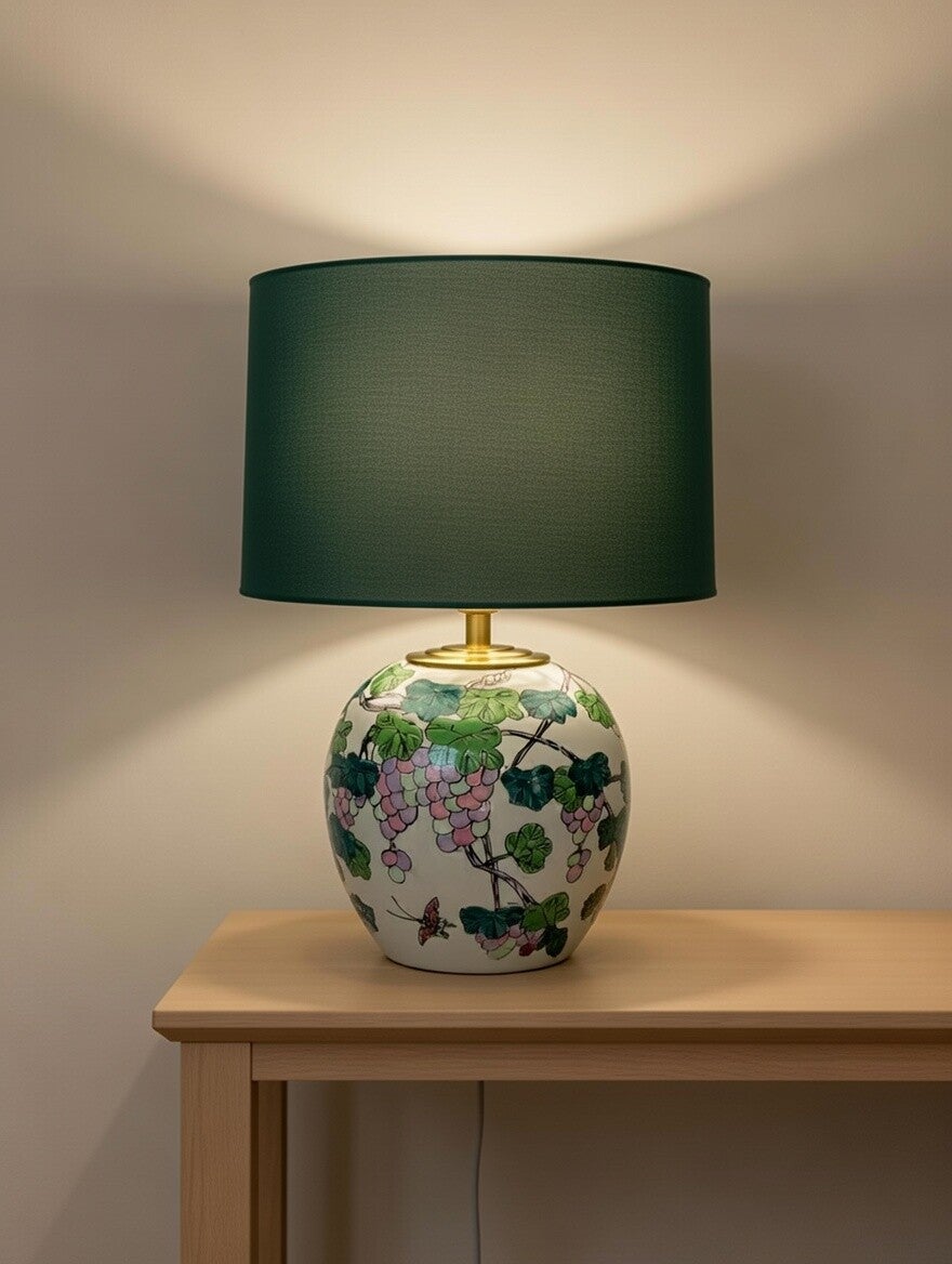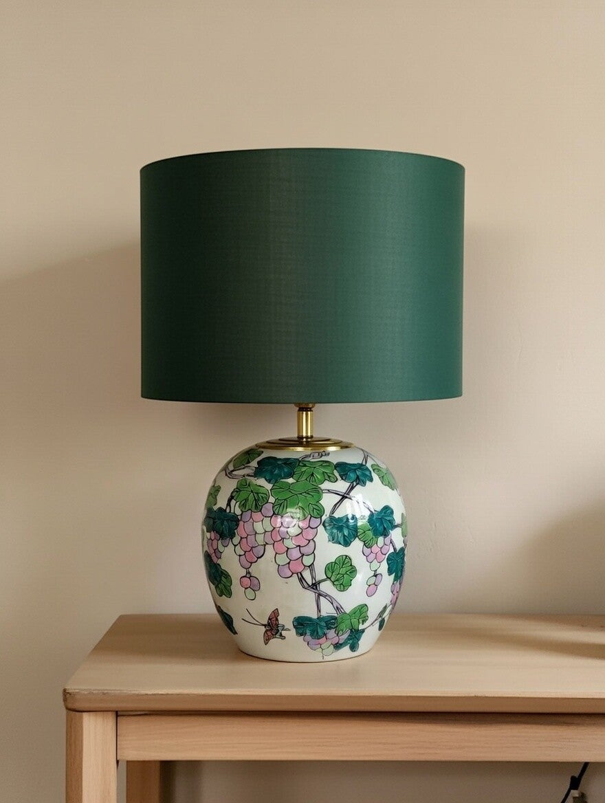 Werkelijk een prachtige lampenvoet gemaakt van een zware keramieken bolvaas. De vaas is versierd met druiven en druivenbladeren.