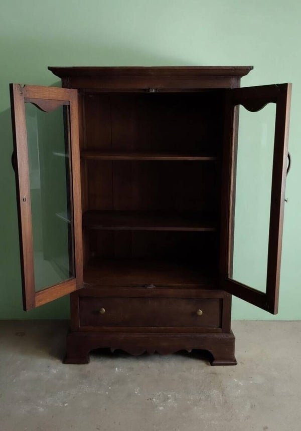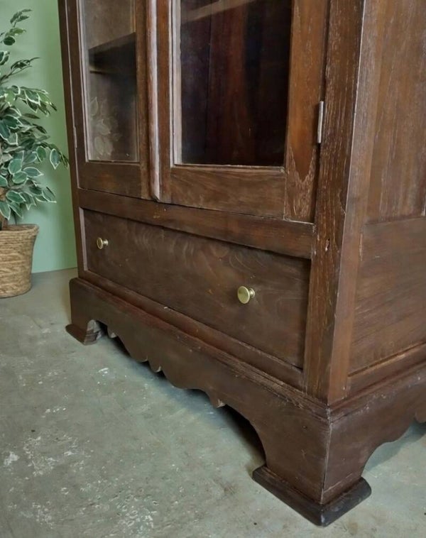 Deze oude vitrinekast ademt geschiedenis. Gemaakt van massief donker teakhout. De donkere teak-kleur die zo kenmerkend is voor oude koloniale en landelijke meubels.
