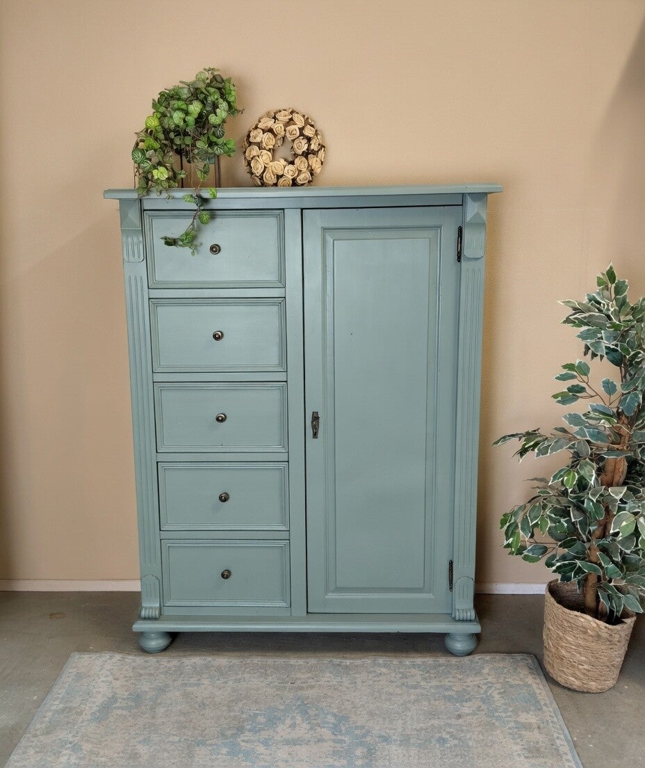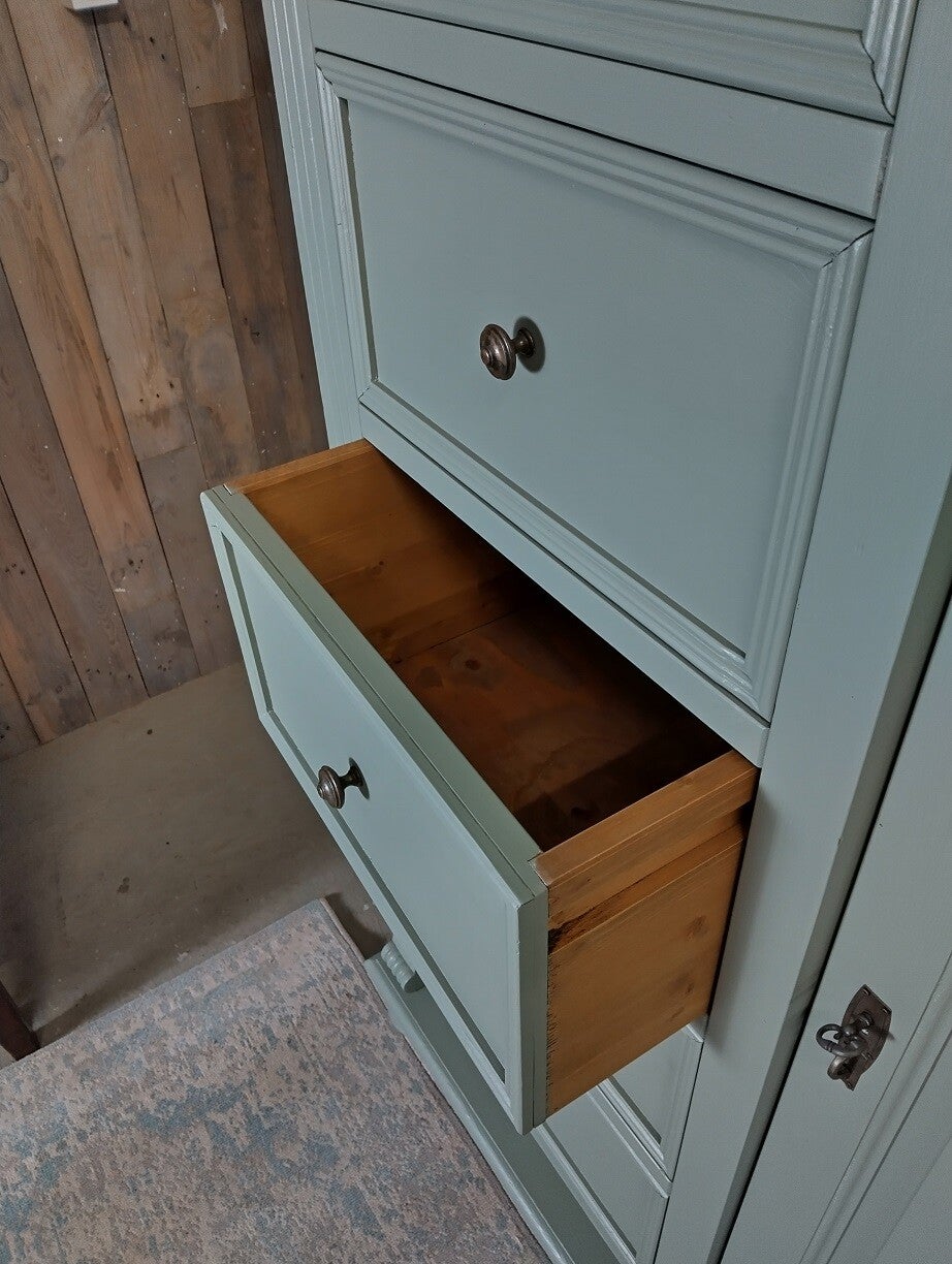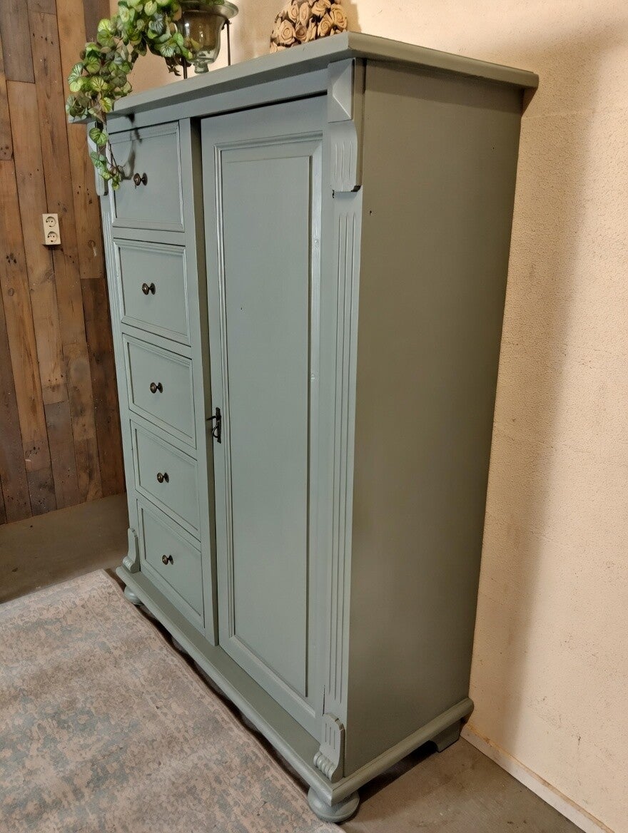 We hebben de kast geschilderd in een oud groene kleur, wat hem uitstekend staat.