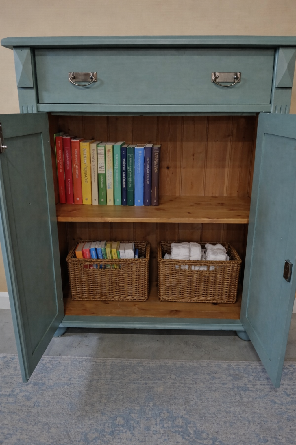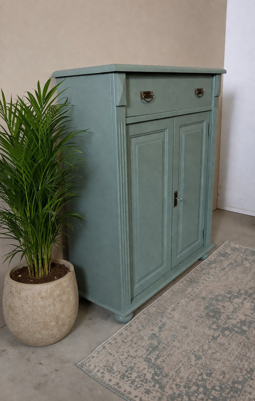 We hebben er voor gekozen de kast een donkere oud groene kleur te geven.